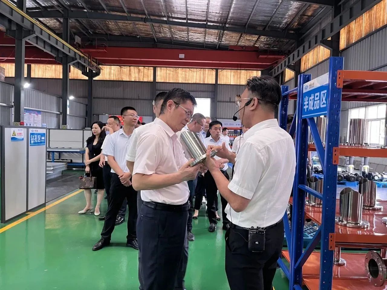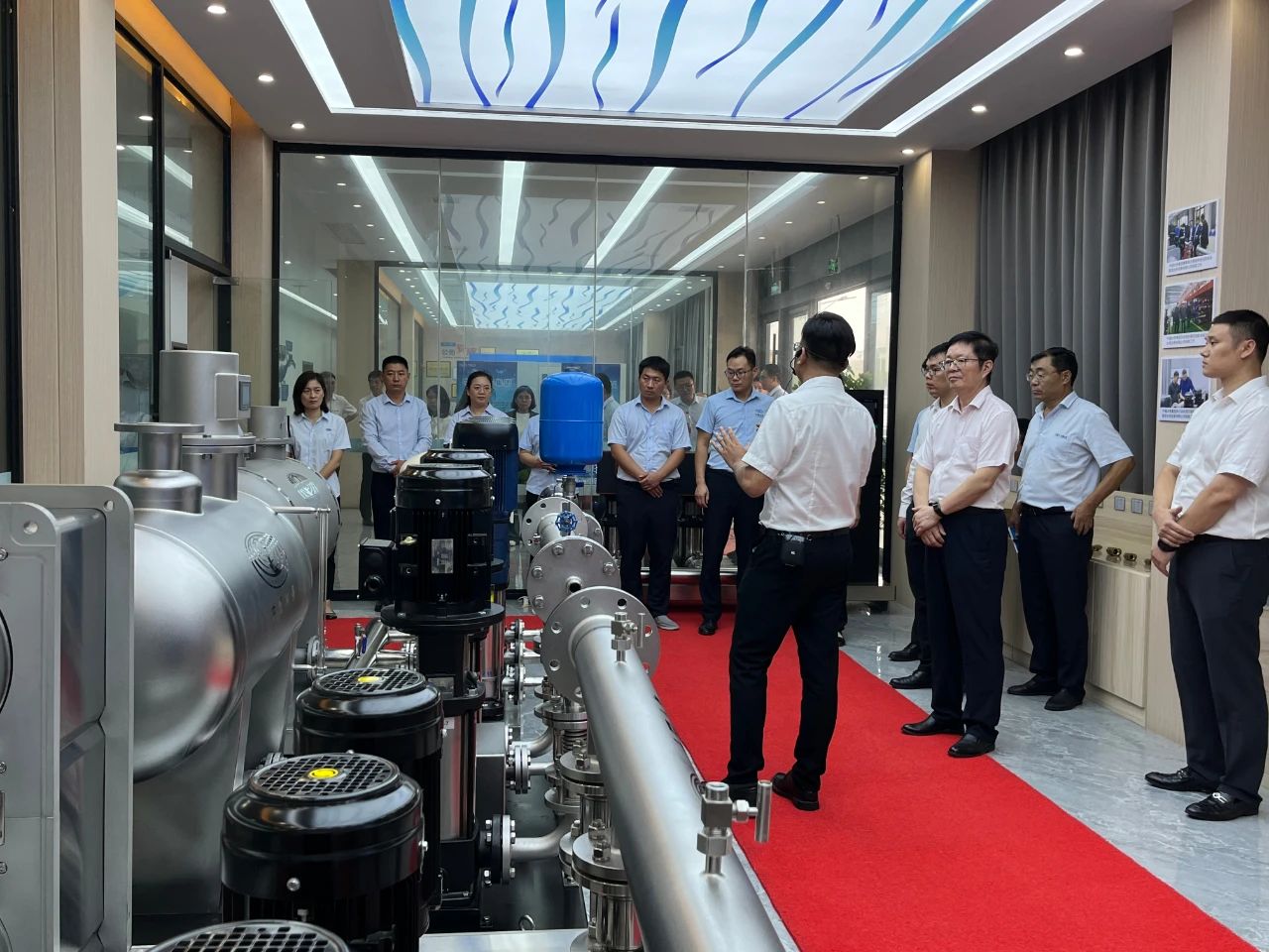 集團(tuán)郭總在我司講解團(tuán)的陪同下,帶領(lǐng)集團(tuán)年輕干部培訓(xùn)班成員先后參觀了我司機(jī)械、電氣生產(chǎn)車間、成品庫(kù)、二次供水設(shè)備展廳、二次供水監(jiān)控管理平臺(tái)及數(shù)字化智慧水務(wù)平臺(tái)。